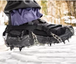 NEHRĐAJUĆI LANCI I OJAČANA KAPICA PETE– izrađeni od nehrđajućeg čelika. Otporni su na hrđu i koroziju. Dovoljno je navući elastični ovratnik i postaviti ih na potplat cipele. Našizupcine oštećuju obuću , jer savršeno prianjaju uz cipelu, aojačani jastučići na peti osiguravaju stabilnost posebno pri spuštanju.