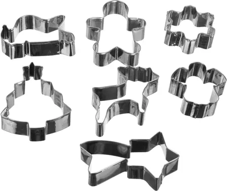 Praktičan set 7 metalnih kalupa za izrezivanje od nehrđajućeg čelika za lako pečenje božićnih kolačića. Nudi oštar rez, udoban profilirani rub i 7 omiljenih oblika. Idealno za medenjake, kekse i fondant – izdržljiv i lako se čisti.