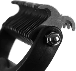 Dvostrani dizajn za sve tipove dlake. Finija strana (17 zupaca, 0,4 cm) za završnu obradu i osjetljiva mjesta, šira strana (9 zupaca, 0,8 cm) za gustu poddlaku i zapetljaje.