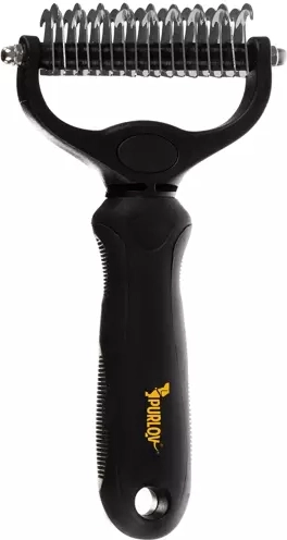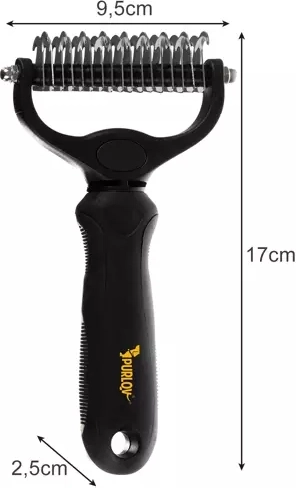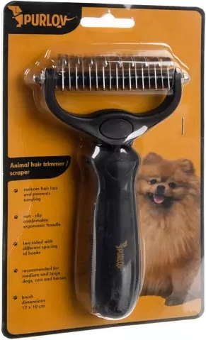 Univerzalni dvostrani trimer i grablje za dlaku PURLOV za pse i mačke kombiniraju stranu sa 17 finijih zupaca i stranu s 9 šire razmaknutih zupaca za gustu poddlaku i finu dlaku. Učinkovito smanjuje linjanje, lako raščešljava čvorove i poddlaku, a zahvaljujući ergonomskoj, protukliznoj ručki ugodno je za upotrebu. Zaobljeni završeci zupaca nježni su prema koži.