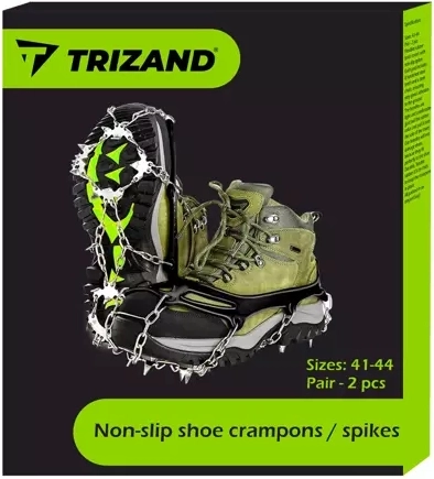 Stabilnost i sigurnost na skliskim površinama. Protusnježne navlake TRIZAND s metalnim čavlima povećavaju prianjanje na zaleđenim pločnicima, u gradu i na terenu. Elastični ovratnik od TPE-a prilagođava se raznim oblicima obuće u rasponu veličina L 41–44 te pritom čvrsto stoji bez oštećivanja cipela.