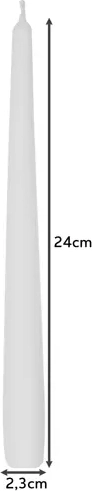 Stvorite ugodnu atmosferu s bijelim koničnim svijećama koje će odlično upotpuniti svečani stol i interijer. Zahvaljujući visini od 24,5 cm i vitkom promjeru od 2,3 cm djeluju elegantno i odgovaraju većini klasičnih svijećnjaka.