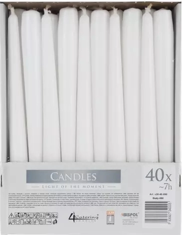 Svijeće su izrađene od kvalitetne parafinske smjese koja osigurava stabilan plamen i vrijeme gorenja do 7 sati. Idealne su za vjenčanja, krštenja, domjenke, crkvene obrede i kućnu uporabu – a u praktičnom pakiranju od 40 komada lako ćete pripremiti ujednačenu dekoraciju.