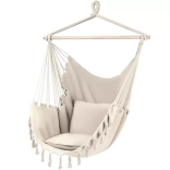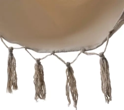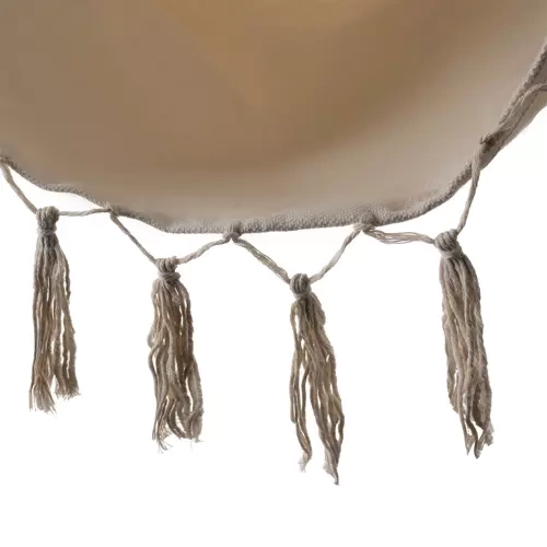 Montaža je jednostavna zahvaljujući čvrstoj visećoj omči i izdržljivim užadima, koja ravnomjerno raspoređuju opterećenje do 120 kg. U pakiranju ćete naći i 2 jastuka (40 × 40 cm) za mekan oslonac leđa i glave. Neutralna bež boja odlično se uklapa s prirodnim materijalima i modernim boho stilom.