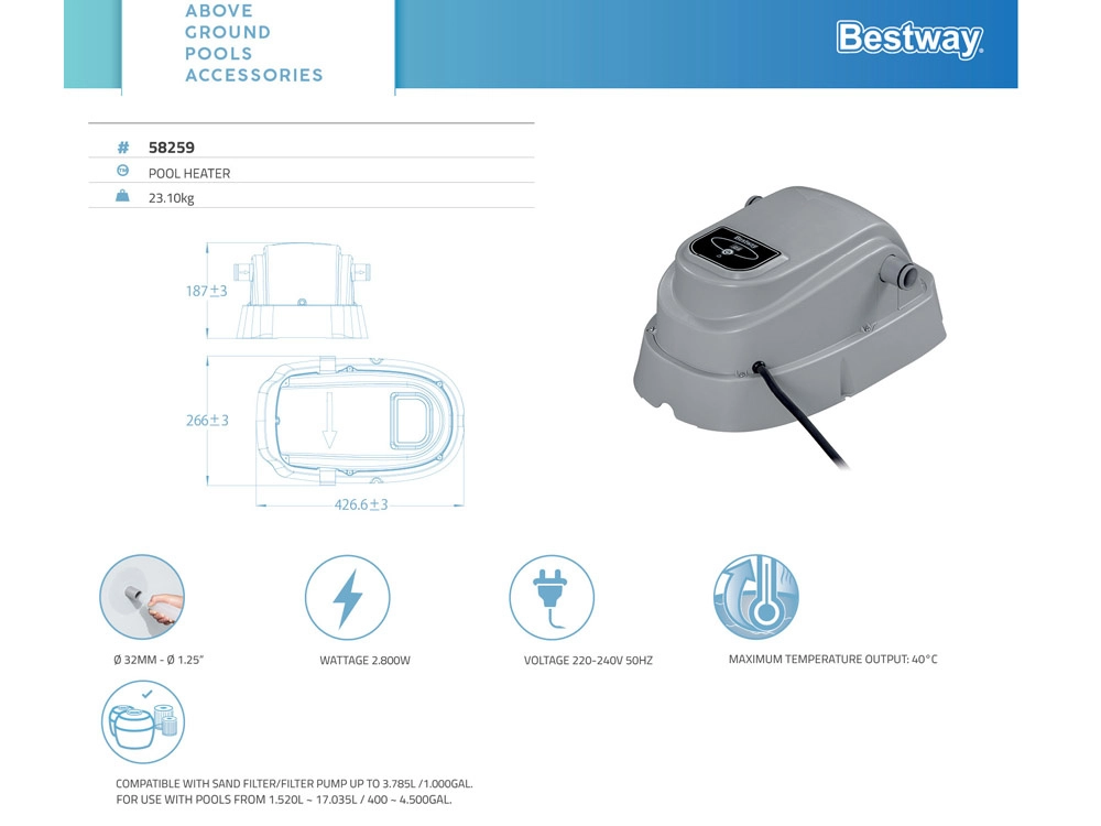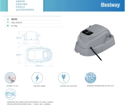 Instalacija je jednostavna – grijač jednostavno priključite na filtracijski sustav bazena. Uređaj je namijenjen za nadzemne bazene zapremine 1 520–17 035 l i protok pumpe do 3 785 l/h. Maksimalna temperatura je 40 °C (dostižna ovisno o ulaznoj temperaturi vode i okolini). Robusna konstrukcija i dugi napojni kabel 3,5 m olakšavaju postavljanje i rad.