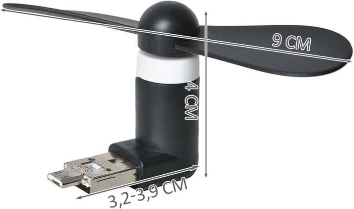Praktični mini ventilator s dvostrukim priključkom 2u1 spaja se izravno na microusb telefon ili na standardni usb priključak (powerbanka, prijenosno računalo). Energiju crpi iz samog priključka, pa ne treba baterije niti punjenje. Za upotrebu s telefonom potrebna je OTG funkcija – prije kupnje je molimo provjerite. Ventilator ne radi preko redukcija ili produžnih adaptera.