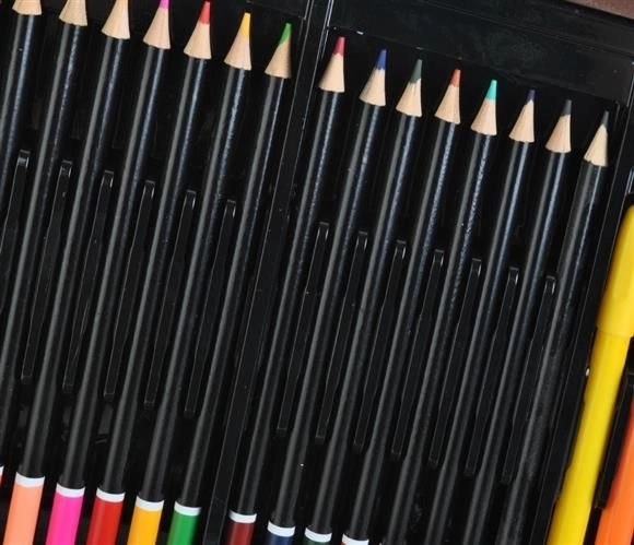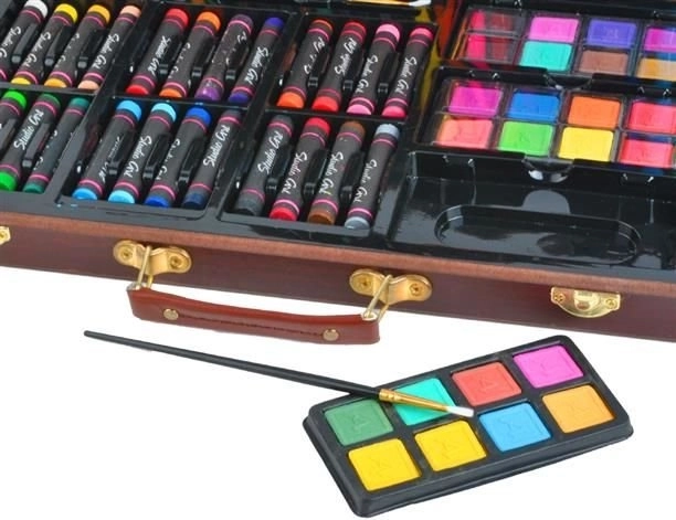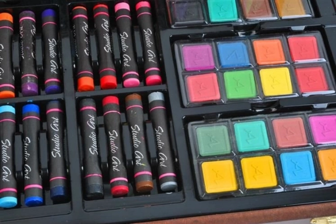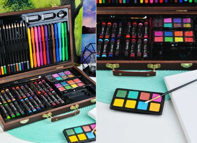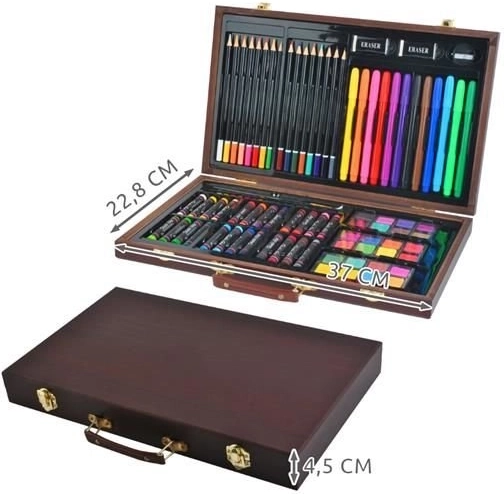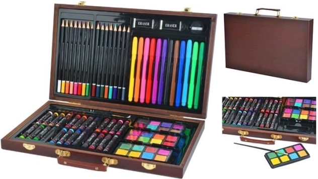 Sav pribor za crtanje i slikanje uredno je posložen u sklopivom drvenom kovčegu s pretincima, pa uvijek imate brz i jednostavan pristup svemu što trebate.