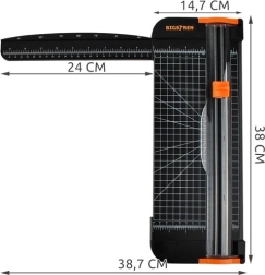 Ovaj rezač papira omogućuje precizne ravne i kose rezove do formata A3. Pregledna centimetarska i inčna ljestvica zajedno s označenom mrežom i kutomjerom omogućuje brzo i pouzdano poravnanje dokumenata, fotografija ili promotivnih materijala.