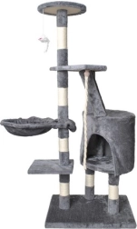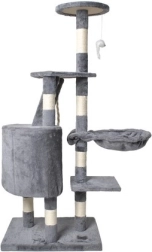 Nudi više razina za mačke, uključujući udobnu kućicu, stepenice i viseću igračku koja potiče mačju znatiželju.
