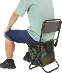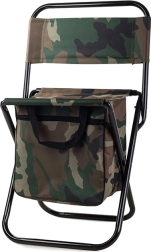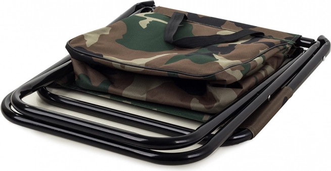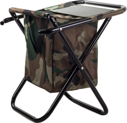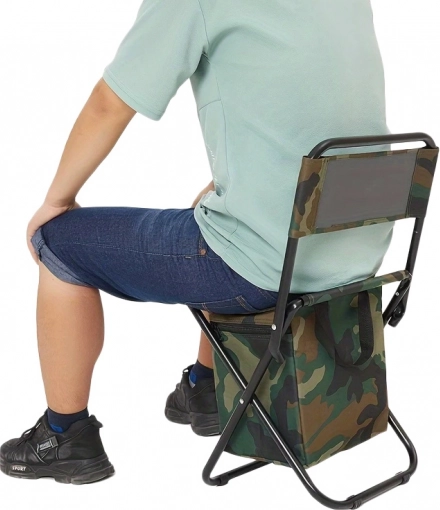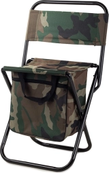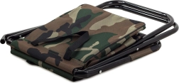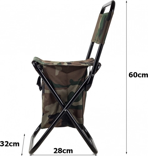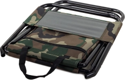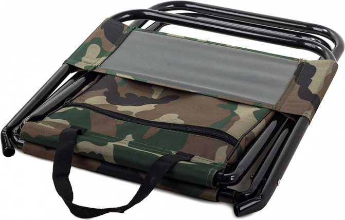 Lagana i kompaktna turistička stolica u maskirnom stilu MORO s praktičnim naslonom za leđa i integriranom torbom ispod sjedala. Nudi udobno sjedenje pri ribolovu, kampiranju i na festivalima, stabilan čelični okvir te jednostavno prenošenje zahvaljujući ručki i naramenicama.