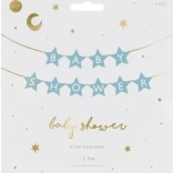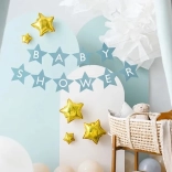 Dodajte svojoj proslavi bebe nježan dodir dekorativnim transparentom u obliku zvjezdica. Natpis „Baby Shower“ u pastelnoplavoj boji izvrstan je izbor za usklađenu tematsku dekoraciju. Transparent je lagan, papirnati i pripremljen za brzo vješanje.