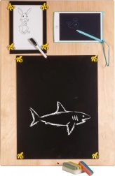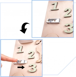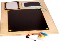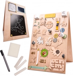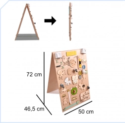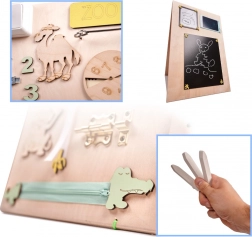Jedinstvena funkcija ove ploče je njena obostranost - jedna strana sadrži niz manipulativnih elemenata, a druga služi kao površina za crtanje i pisanje uz pomoć krede, flomastera ili olovaka. To pomaže djeci razvijati kreativnost i finu motoriku.