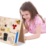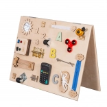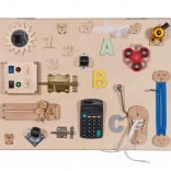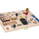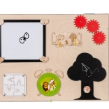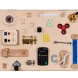 Ova drvena manipulativna ploča puna je raznolikih igračkih elemenata koji pomažu djeci u razvoju njihovih vještina. Djeca se mogu igrati s raznim interaktivnim mehanizmima koji garantiraju zabavu na duge sate.