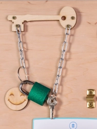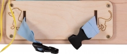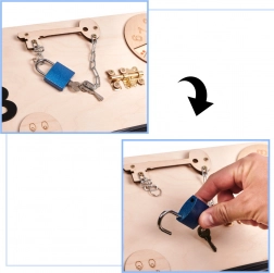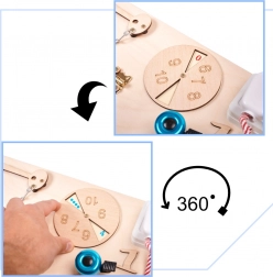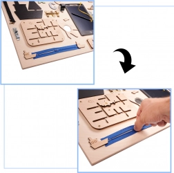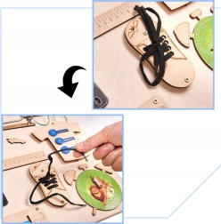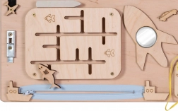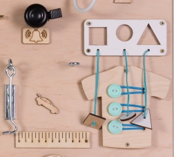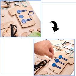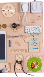 Zahvaljujući raznolikim elementima, poput prekidača, patentnih zatvarača i drugih, drvena manipulativna ploča djeci pruža sigurno okruženje za upoznavanje i učenje. Mališani mogu sigurno rukovati svakodnevnim predmetima, poput utičnice s utikačem ili prekidača, a istovremeno razvijati svoje manualne vještine.