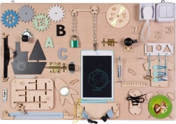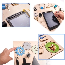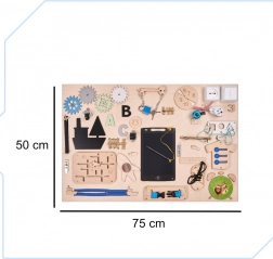 Ploča sadrži različite interaktivne elemente poput prekidača, patentnih zatvarača i drugih sitnica kojima djeca mogu sigurno rukovati za učenje i zabavu.
