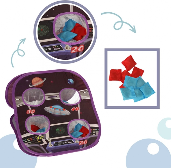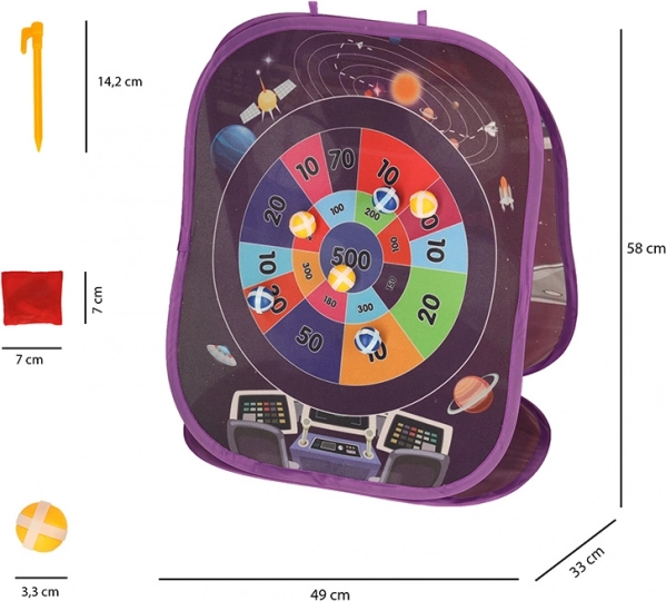 Obostrana igračka sa svemirskim motivom donosi uzbuđenje i zabavu djeci i kod kuće i u vrtu. Na raspolaganju su dvije vrste meta: jedna strana svjetlucave kružne ploče prihvaća ljepljive površine mekih loptica s čičkom, dok druga strana traži da djeca pogode otvore vrećicom.