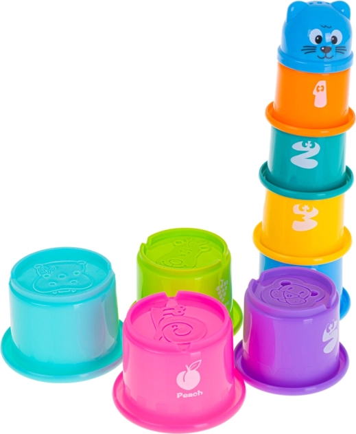 Ovaj raznobojni set plastičnih čašica možete slagati u visoki toranj ili umetati jednu u drugu. Jarke boje, simpatične sličice voća i numeracija motiviraju djecu na igru koja razvija koordinacijske sposobnosti, preciznost prstiju i logičko razmišljanje. Engleske oznake voća na zabavan način upoznaju s stranim jezikom.