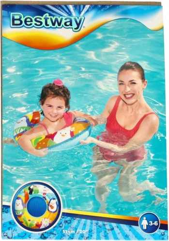 Dječji napuhavajući kolut BESTWAY 51 cm s motivom pingvina. Za dob 3–6 godina, nosivost 60 kg, lagan i kompaktan, idealan za bazen i jezero.