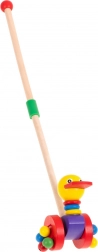Ova šarena drvena patkica je idealna pratiteljica za šetnje. Dizajnirana je kako bi poticala dječju motoriku i kretanje. Zahvaljujući lako upravljivom drvenom štapu, patkica može biti vođena ili se s njom djeca mogu samostalno igrati.