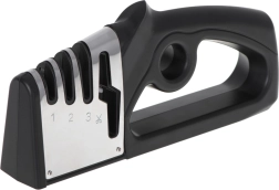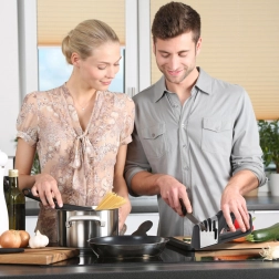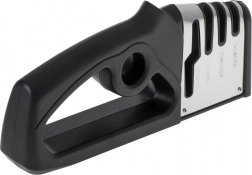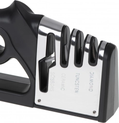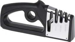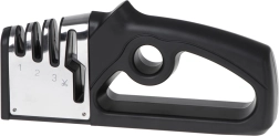 Univerzalni brus 4-u-1 dizajniran je za cjelovitu njegu kuhinjskih noževa i škara. Tri uzastopna stupnja od različitih materijala obnavljaju oštricu od grubog poravnanja do finog poliranja, tako da postižete oštrinu kao u profesionalnoj kuhinji. Četvrti utor namijenjen je za brzo i precizno oštrenje škara.