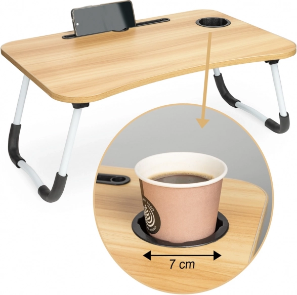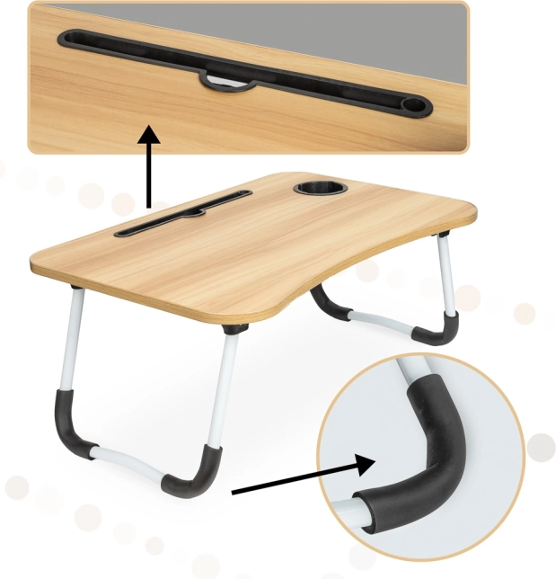 Stol je opremljen utorom za tablet ili telefon i otvorom za kabele, što povećava njegovu praktičnost. Ako tražite savršenog pomoćnika za ugodan rad s bilo kojeg mjesta, ovaj sklopivi stol za laptop je pravi izbor.