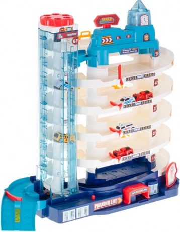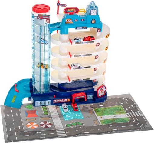 Veliko višekatno parkiralište za djecu nudi čak 5 razina parkiranja, električno i ručno dizalo, svjetlosne i zvučne efekte te dodatno 8 metalnih/plastičnih autića i igraču podlogu s gradom. Sjajna igračka za razvoj mašte, fine motorike i logičkog razmišljanja.