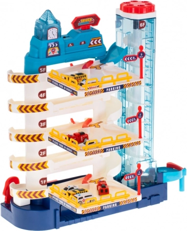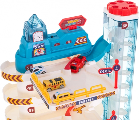 Ova realistična parkirna kuća pretvara dječju sobu u užurbani grad. Zahvaljujući automatskom dizalu autići se podižu sve do gornjih katova, a niz spiralne rampe jure dolje. Bliješteća svjetla i vesela melodija iz tornja s satom daju igri posebnu atmosferu – zvuk se može zasebno uključiti i isključiti.