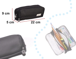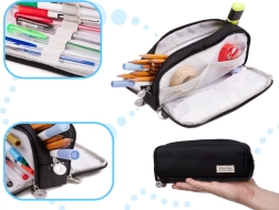 Univerzalna pernica za školu, fakultet i ured. Tri odvojene komore s patentnim zatvaračem olakšavaju organizaciju i brz pristup olovkama, markerima, ravnalu i ostalim dodacima. U bočnim odjeljcima nalaze se mali džepići i elastične trake koje pomažu čvrsto pričvrstiti pribor.