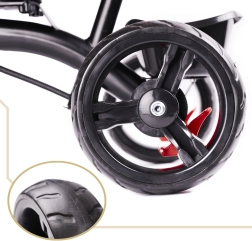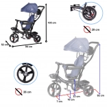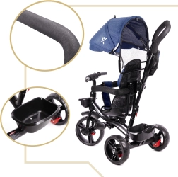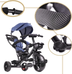 Za maksimalnu kontrolu tu je okretljivo sjedalo 360°, koje omogućuje vožnju prema roditelju i u smjeru kretanja. Slobodni kotač (slobodni hod) omogućuje roditelju preuzeti pogon jednim prekidačem. Bezzračne gume osiguravaju udobnost poput zračnih, bez brige o tlaku i riziku od defekta. Ne nedostaje trokutasta sklopiva sjenila u 3 položaja s mrežicom, odvojiva upravljačka šipka s pjenastom oblogom i praktični spremnici.