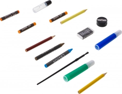 Set uključuje kist, olovku, šiljilo, gumicu i ljepilo. Svaki element je pažljivo pospremljen i spreman za korištenje, što olakšava vaš rad.