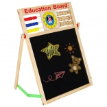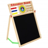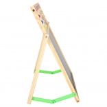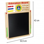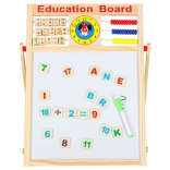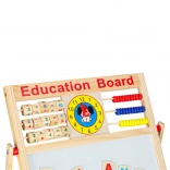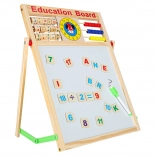 Dvostrana dječja ploča spaja magnetnu bijelu površinu i krednu crnu stranu u čvrstom drvenom okviru. U kompletu su abacus, učno brojčanik sati i set 54 magnetska slova i brojke za razigrano učenje čitanja i računanja.