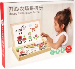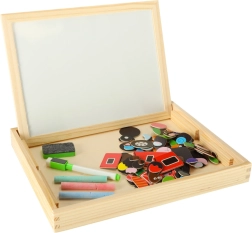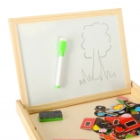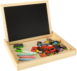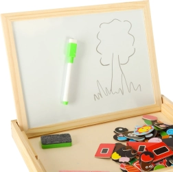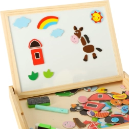 Dvostrana drvena ploča s magnetnim puzzleima idealna je za dječju kreativnu zabavu. Ploča je izrađena od kvalitetnog prirodnog drva i uključuje razne elemente koji podupiru učenje i igru.