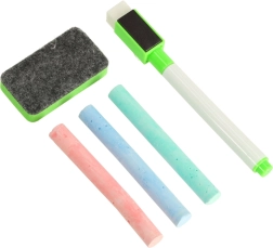 Set sadrži sve potrebno za početak zabave, uključujući dvostranu ploču, približno 100 magneta, kolor krede, spužvu, markere s filcom i upute za uporabu.