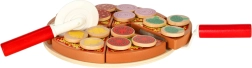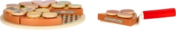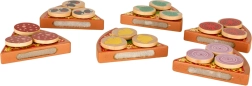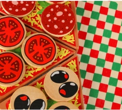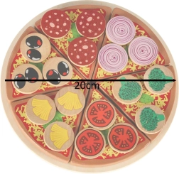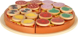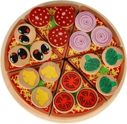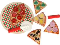 Sadrži 6 komada pizze, 18 različitih drvenih dodataka, nož, lopaticu i tanjur. Djeca mogu slagati omiljene kombinacije i posluživati cijeloj obitelji.