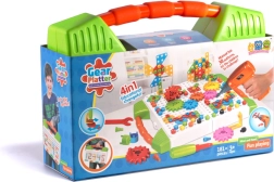 Set vijaka, spojki i oblikovanih dijelova u živim bojama omogućuje slaganje uzoraka, slika i jednostavnih 3D konstrukcija te učenje boja i oblika kroz igru.