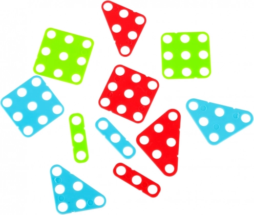 Set obojenih vijaka, gumbića i oblika omogućuje slaganje cvjetića, životinja i geometrijskih uzoraka te uči prepoznavati boje i oblike.