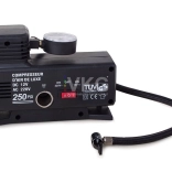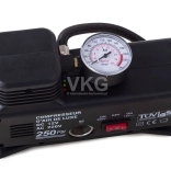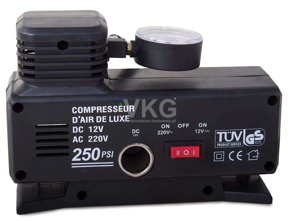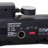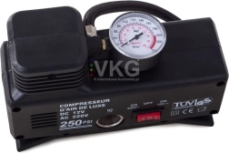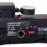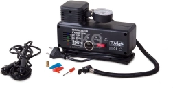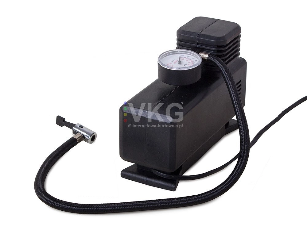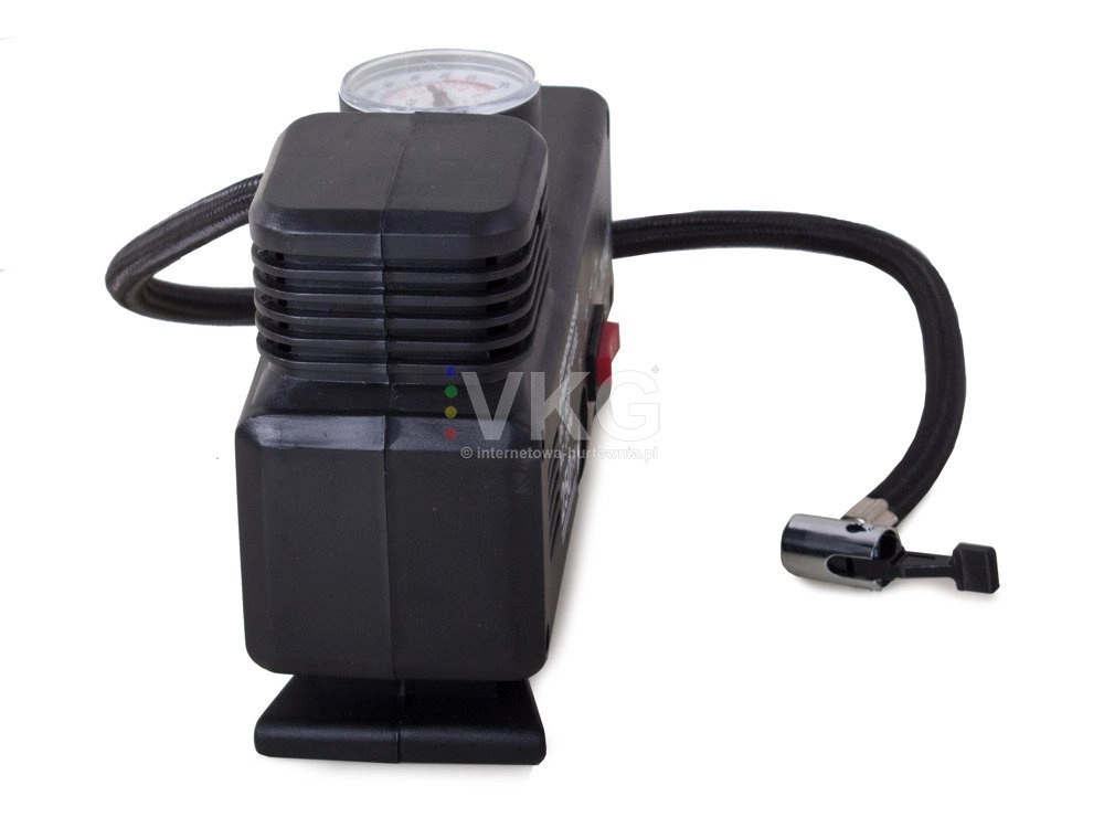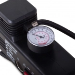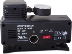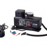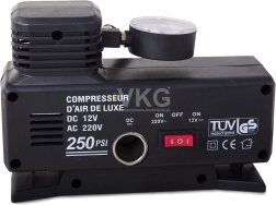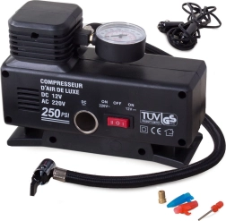 Praktični automobilski kompresor napajan iz utičnice upaljača 12 V i iz mreže 230 V. Lako i brzo napuhujete automobilske i biciklističke gume, ali i lopte i madrace na napuhavanje. U kompletu je manometar, zračna cijev oko 50 cm i 3 univerzalna nastavka za sportsku opremu.