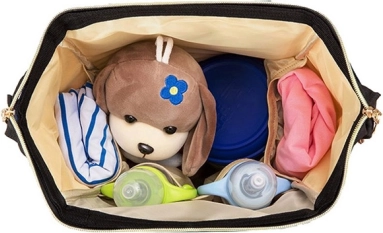 Na prednjoj strani nalaze se tri toplinski izolirana termo džepa za bočice ili hranu, a sa strane dva prostrana džepa s podstavom otpornom na vlagu. Ruksak se može praktično pričvrstiti na kolica, nositi na leđima zahvaljujući podesivim naramenicama ili u ruci preko čvrstih ručki. Izdržljiv materijal OXFORD podnosi svakodnevnu upotrebu i nepovoljne vremenske uvjete.