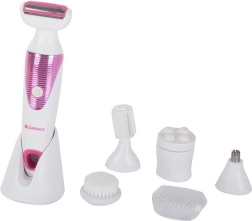 Praktičan set za svakodnevnu njegu tijela u jednom uređaju: ženski depilator 5 u 1 s izmjenjivim glavama za brijanje, oblikovanje obrva, podrezivanje dlačica u nosu i ušima, čišćenje kože i masažu. Zahvaljujući ergonomskom obliku i protukliznoj površini udobno leži u ruci, nježan je prema svim tipovima kože i ne uzrokuje iritaciju niti zapinjanje. Periva brijaća glava, bežični rad i praktični stalak osiguravaju jednostavnu upotrebu i odlaganje.