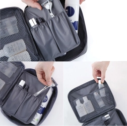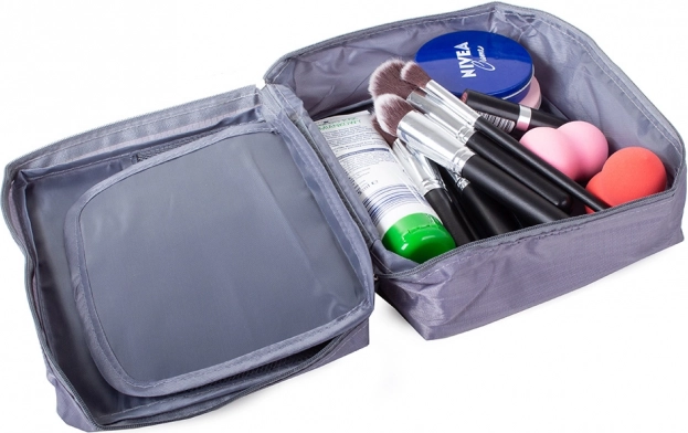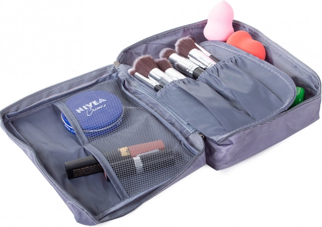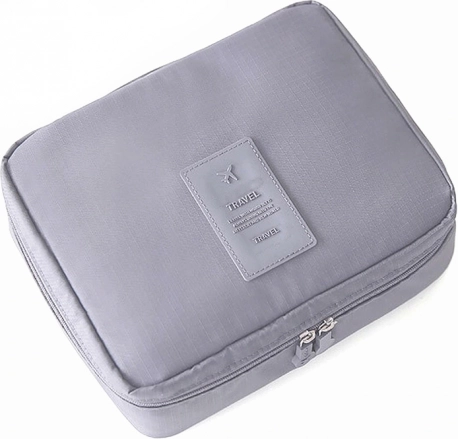 Ovaj sivi putni organizator za kozmetiku pruža dovoljno prostora za sve vaše potrebe. Sadrži jedan glavni pretinac i izvlačivu komoru s dvije džepove zatvorene čičak-trakom, što omogućuje povećanje kapaciteta. Nadalje, sadrži dva mrežasta džepa za sitnice.