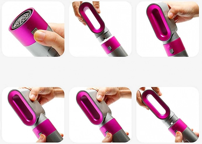 Koncentrator za brzo sušenje, plosnata četka za zaglađivanje i okrugla četka za volumen i prirodne kovrče. Jednostavna i brza zamjena u par sekundi.