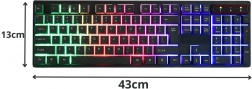 Ova gaming tipkovnica spaja moderan dizajn i ergonomiju s praktičnim funkcijama za svakodnevnu upotrebu. Puna veličina s numeričkim blokom olakšava rad u tablicama i igranje, dok tihi membranski prekidači osiguravaju neometan rad i u kasnim satima. RGB pozadinsko osvjetljenje daje vašem stolu upečatljiv izgled i može se jednostavno uključiti ili isključiti tipkom Scroll Lock.