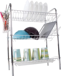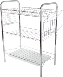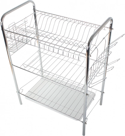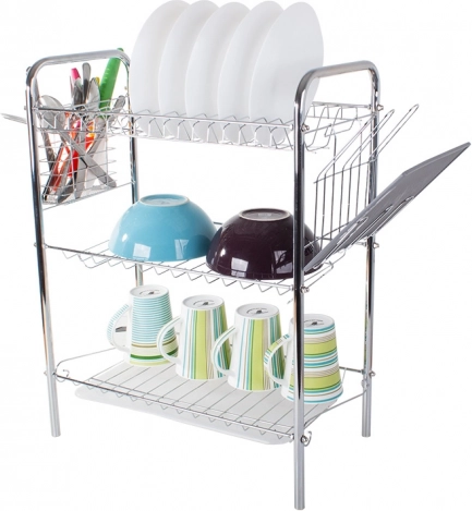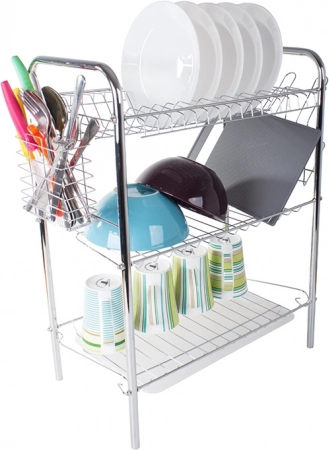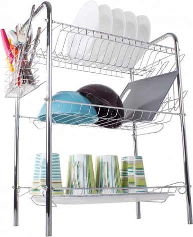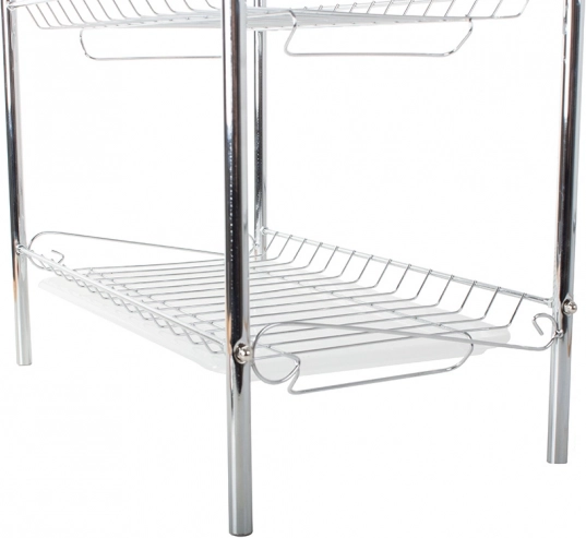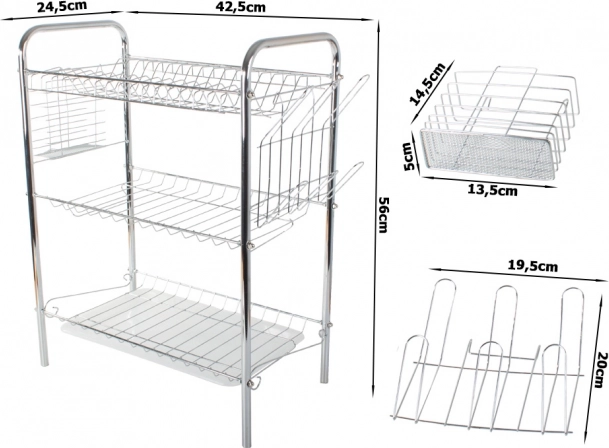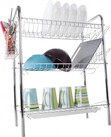 Trokatni ocjeđivač posuđa idealno je rješenje za svaku kuhinju u kojoj je potrebno učinkovito iskoristiti prostor. Robusna metalna konstrukcija s kromiranim izgledom izdržljiva je i jednostavna za održavanje. Zahvaljujući promišljenom rasporedu, tanjure odlažete u okomite pregrade, zdjele i posude na police, a šalice ili čaše na donju razinu.
