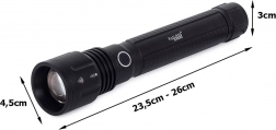 Zahvaljujući funkciji zumiranja moguće je glatko mijenjati žarišnu duljinu svjetla i domet do 1000 metara. Za napajanje se koriste visokokvalitetne litij-ionske baterije 26650, koje produžuju vrijeme rada. Svjetiljka nudi više načina rada: 100%, 75%, 50%, stroboskop i SOS.