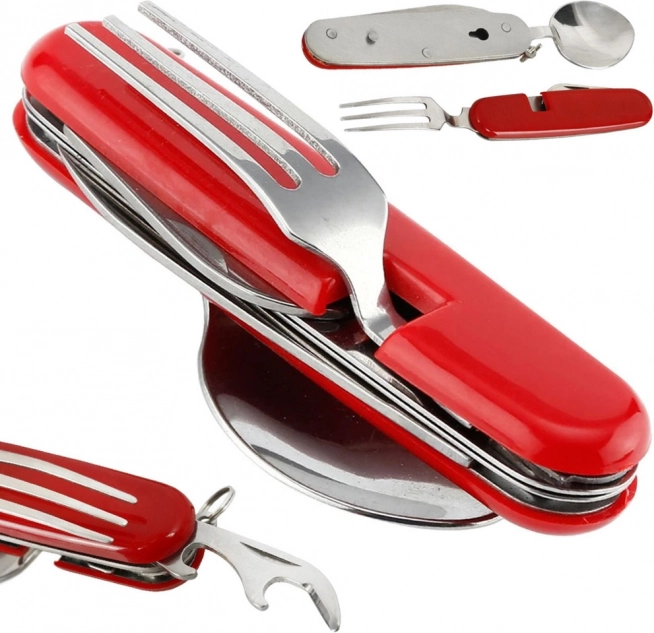 Multifunkcionalni turistički set 4u1 je idealan pratitelj za svakoga tko voli putovanja i boravak u prirodi. Ovaj set kombinira vilicu, žlicu, nož i otvarač za boce u kompaktnoj i lako prenosivoj izvedbi.