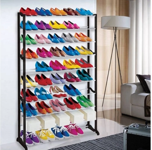 Organizirajte svoju obuću pametno i stilski. Ovaj višerazinski stalak za cipele s 10 polica prima do 50 parova, pa bez problema pokriva obiteljsku kolekciju i sezonsku obuću. Crni okvir s kromiranim prečkama uklapa se u moderne interijere, a zahvaljujući kompaktnoj dubini od 25 cm stane i u uži prostor.