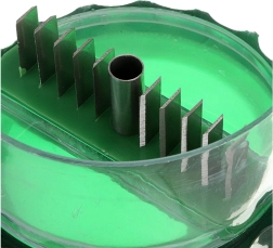 Dvije komore za sjeckanje s noževima od nehrđajućeg čelika jamče učinkovito i sigurno rezanje. Zahvaljujući kompaktnim dimenzijama 9 × 6 cm stane u svaku ladicu i jednostavno se održava čistom.