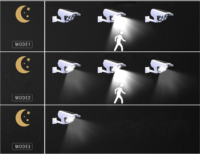 Kamera nudi tri različita načina osvjetljenja: potpuno osvjetljenje pri detekciji pokreta, štedni način i kontinuirano svjetlo. Ovaj svestrani proizvod je dizajniran tako da zadovolji sve vaše potrebe za nadzornim osvjetljenjem.