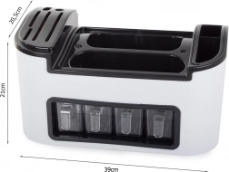 Olakšajte organizaciju u svojoj kuhinji ovim praktičnim kuhinjskim organizatorom. Nudi višerazinsku konstrukciju koja osigurava lak pristup svim potrebnim predmetima. Na gornjoj razini lako ćete smjestiti svoje omiljene začine, staklenke ili boce. Sa strana je dostupan prostor za kuhinjske alate, poput noževa, vilica ili lopatica.