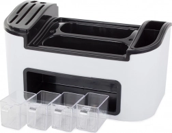 Donji dio organizatora sadrži četiri prostrane ladice od estetske prozirne plastike, idealne za pohranu kave, čaja ili šećera. Svaka komponenta organizatora lako se uklanja radi temeljitog pranja, a baza služi kao ocjeđivač za osiguranje suhoće.